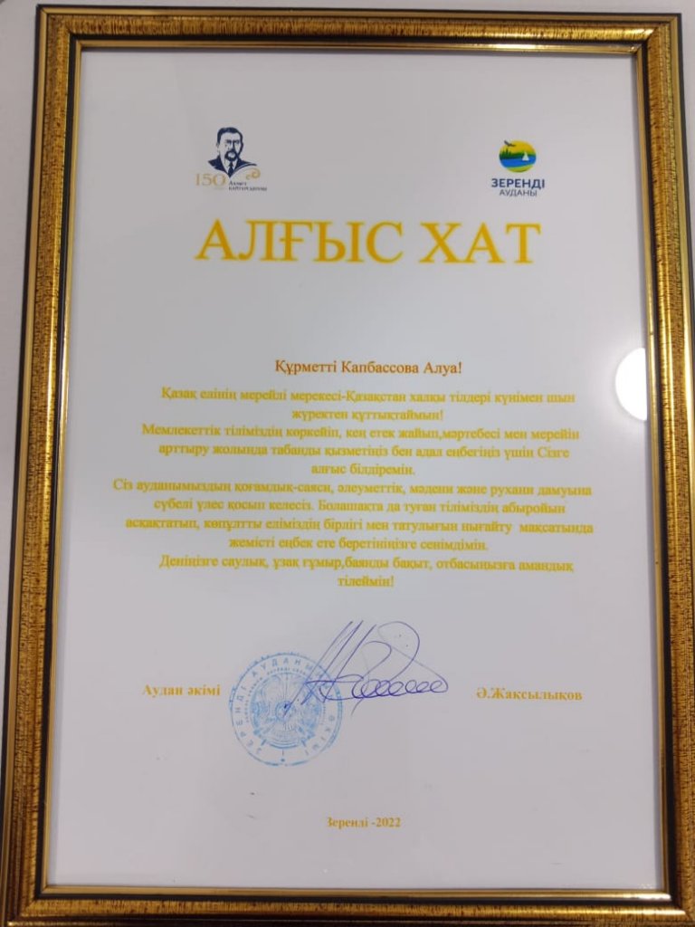 Мектебіміздің 10-сынып оқушысы Капбасова Алуа Зеренді ауданының әкімі Әсен Жақсылықов атынан "Алғыс хат" алды. Құттықтаймын!