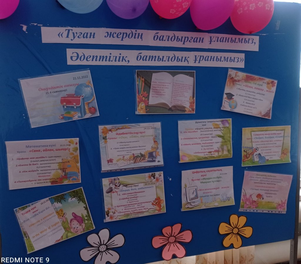 "Туған жердің балдырған ұланымыз, әдептілік, батылдық ұранымыз" атты мектебімізде бастауыш сынып апталығы басталды. Мақсаты: Жаңа инновациялық технологияларды іс-тәжірибеде қолдану. Оқушылардың белсенділігімен ізденімпаздығын арттыру.