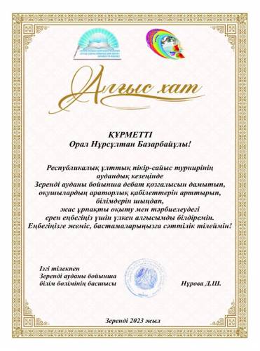 Республикалық ұлттық пікір- сайыс турнирінің аудандық кезеңінде мектебіміздің "Ұшқыр ой"алаңының "Алаш" тобы ауданнан ІІ орын иеленді. Сонымен қоса жетекшісі Орал Нұрсұлтан Б. білім бөлімінің басшысының алғыс хатымен марапатталды. Құттықтаймыз!